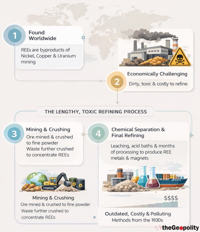Although called REE’s they are not rare and are found in the earth’s crust across the world. REEs are by-products of mining for other metals such as nickel, copper and uranium. While not rare on Earth, they are rarely found in sufficient abundance in a single location for their mining to be economically viable. The real challenging aspect lies in the refining process, which is dirty and toxic, time-consuming, and costly. The process is also not particularly complex, and many nations could start their own REE industry if they wanted to do so.